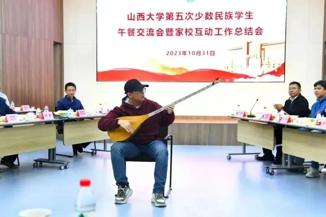 会上,同学们热情高涨,专程带来了民族乐器,载歌载舞,展现本民族的歌舞文化,引得掌声阵阵。师生围坐在一起,合着充满民族风情的音乐,一起为表演的同学打拍伴奏,不时传出阵阵欢快的谈笑声。王仰麟寄语同学们要珍惜学习机会,脚踏实地,努力学习,全面提升个人能力,以高标准、高要求完成学业。要铸牢中华民族共同体意识,像石榴籽一样紧紧抱在一起,团结友爱、互帮互助,自觉维护民族团结,为促进民族团结进步作出贡献。
