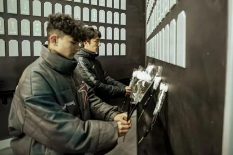 23日上午,师生们怀着沉重的心情步入大同煤矿万人坑纪念馆。沿着幽深的展陈通道缓缓前行,累累白骨在昏暗的光线下静默陈列,锈蚀的矿灯、破损的安全帽和泛黄的工牌,都在无声诉说着那段充满苦难的历史。在庄严肃穆的纪念碑前,全体师生垂首默哀、敬献鲜花,用无声的静默表达对遇难矿工的深切缅怀。这段浸满血泪的历史教训深深烙印在我们心中,化作矢志奋发、报效祖国的坚定信念。